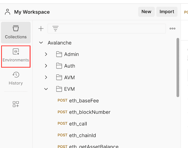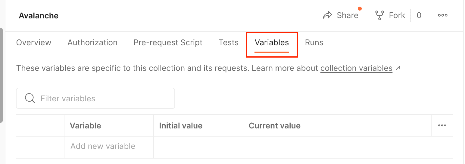 Only default variables are used in the Avalanche Environment file. To learn more about using the secret type of variables, please checkout the Postman documentation.